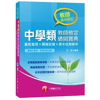書名:中學類教師檢定通關寶典:重點整理+模擬試題+歷年試題解析 語言:繁體中文 ISBN:9789864870332 頁數:576 出版社:千華數位文化 作者:艾育 出版日期:2017/05/19 類別:考試用書 |